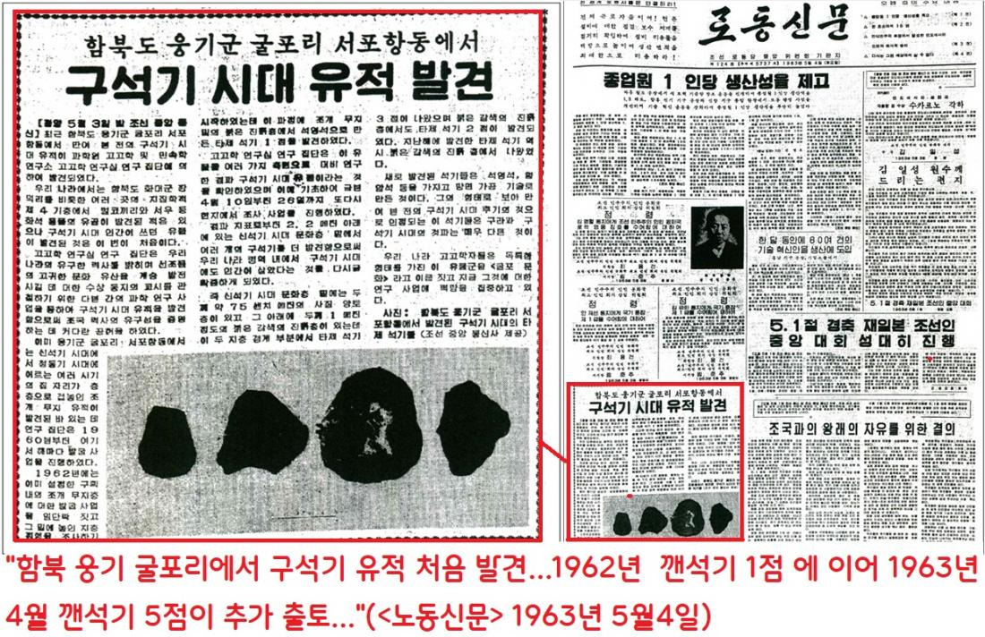그렇게 동으로, 동으로 도미노처럼 이어진 ‘고인류-구석기’ 소식은 한반도 문턱에서 급정거했다. 그로부터 30년 가까이 지난 1963년 5월4일자 북한 노동신문이 흥미로운 기사를 싣는다. ‘함북 웅기 굴포리에서 구석기 유적이 발견되었다’는 것이었다.