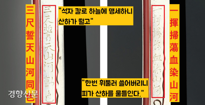 이 두 장검의 칼날에는 이순신 장군이 손수 지은 싯구가 새겨져 있습니다. ‘석자 칼로 하늘에 맹세하니 산하가 떨고(三尺誓天山河動色)’(장검1), ‘한번 휘둘러 쓸어버리니 피가 산하를 물들인다(一揮掃蕩血染山河)’(장검2)는 글귀인데요.