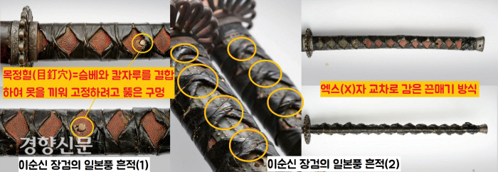우선 슴베와 칼자루를 결합하여 못을 끼워 고정하기 위해 뚫은 구멍(목정혈·目釘穴), 칼자루를 단단하게 쥘 수 있도록 가죽끈을 엑스(X)자로 교차해 감은 끈매기 방식이 그렇고요.