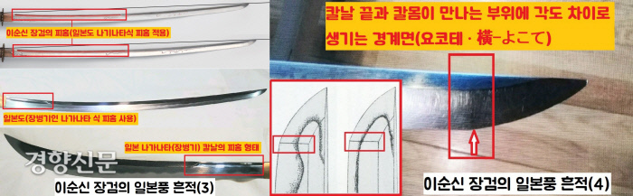 이석재 경인미술관장은 “칼날에서 칼끝과 칼몸이 만나는 부위에 각도의 차이로 생기는 요코테(橫-よこて)의 흔적이 확인된다”면서 “이것도 일본풍”이라고 전했습니다. 물론 이순신 장검 두자루에 일본풍의 요소만 있는 것은 아니죠.