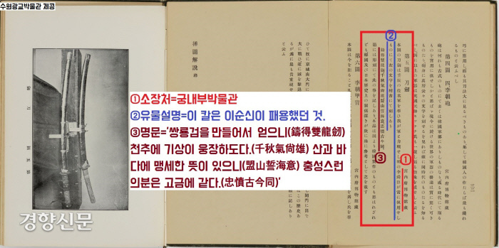 일제가 설립한 조선고서간행회가 발간한 <조선미술대관>(1910년)에 이순신 장군이 차고 다녔다는 칼 사진이 나옵니다.