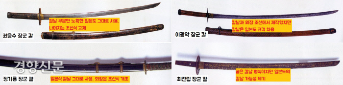 권응수(1546~1608)·정기룡(1562~1622)·최진립(1568~1636)·이광악(1557~1608) 장군의 칼도 비슷합니다. 왜군과의 대등한 싸움을 위해, 급한대로 노획한 일본도의 형식과 규격을 빌려 칼날을 만들고, 조선식의 칼집과 칼자루 등의 부속품을 단 새로운 칼을 만든 겁니다. 임진왜란을 계기로 일본풍 칼의 장점을 조선칼의 제작방식에 일부 적용했습니다.