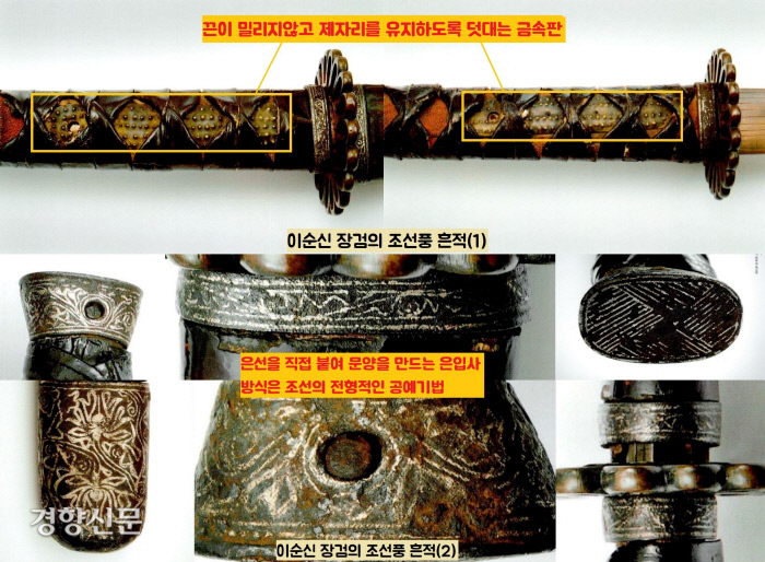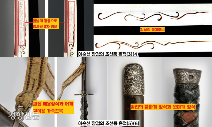 칼날에 새긴 황동입사글씨와 물결무늬, 칼집의 패용장식과 어깨걸이용 가죽끈목, 칼집의 끝마개 및 윗마개 장식 역시 마찬가지입니다. 정리한다면 이순신 장검은 조선칼의 주된 요소에, 일본풍의 일부 요소를 결합한 칼이라 할 수 있습니다.