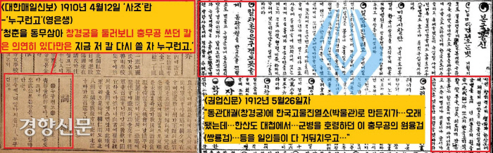 국권침탈 직전인 1910년 4월12일자 <대한매일신보>에 “창경궁에 충무공이 쓰던 칼이 있는데 이 비상시국에 그 칼을 쓸 자가 누구냐”고 꼬집는 시조가 실립니다. 창경궁 궁내부 박물관에 존재했다는 얘기죠.