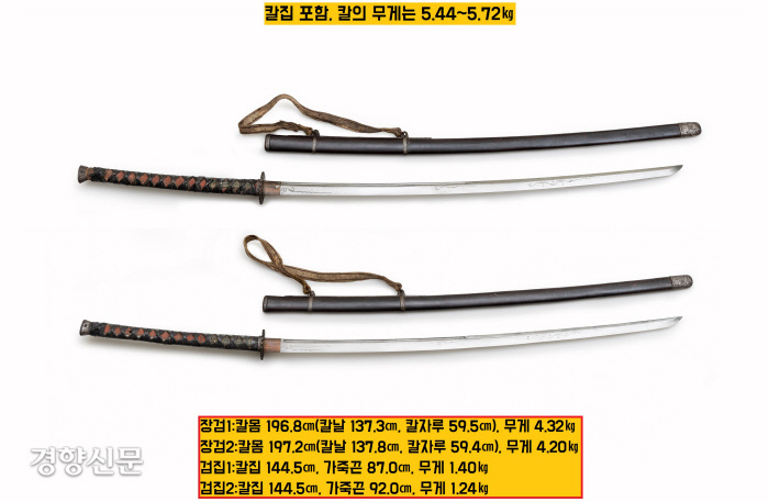 ‘이순신 장검’ 두자루 모두 길이가 2m에 가까운 어마어마한 칼입니다. ‘장검1’은 196.8㎝(칼날 137.3㎝ 칼자루 59.5㎝)에 무게만 4.32kg에 이르고요. ‘장검2’는 197.2㎝(칼날 137.8㎝, 칼자루 59.4㎝)에 4.20kg에 달합니다. 칼집(장검 1·2 모두 144.5㎝)과 가죽끈(장검1=87㎝, 장검2=92㎝)까지 합치면 그 무게는 5.72㎏(장검1)~5.44㎏(장검2)에 이르죠.