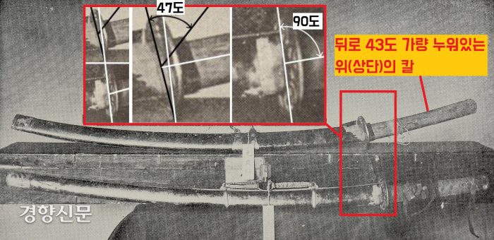 또 코등이(슴베 박은 칼자루의 목 쪽에 감은 쇠테)가 국화문양인 점도 일본풍입니다. 칼날의 형태나, 피를 흘려보내고 칼의 무게를 줄이려고 판 일본식 ‘피홈(혈조·血漕)’ 등도 그렇습니다.