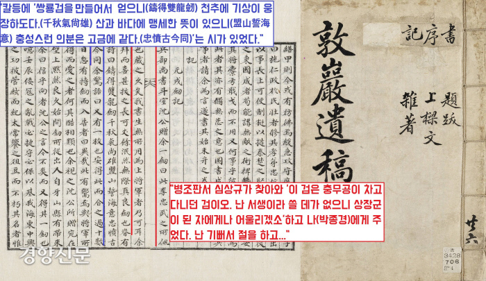 이 싯구가 주목을 끌었습니다. 순조 연간(1800~1834)에 훈련도감을 역임한 박종경(1785~1817)의 문집(<돈암집> ‘원융검기’)에도 바로 이 시와 함께 이순신 쌍룡검이 등장하거든요. 조혁상 홍익대 초빙교수가 이 ‘원융검기’를 전문번역했는데요.