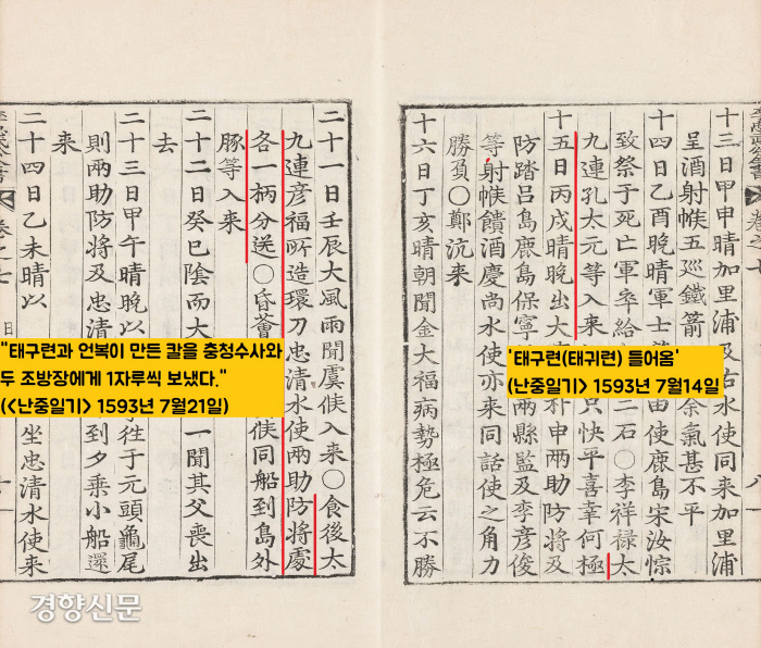 마침 장군의 <난중일기> 1595년 7월14일자에는 ‘태구련(太九連·태귀련과 동일인물 추정) 등이 들어왔다’고 했고요. 21일자는 “태구련과 언복이 만든 칼을 충청수사와 두 조방장에게 1자루씩 보냈다”고 했습니다.