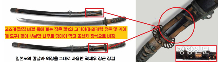 곽재우 장군(1552~1617)의 ‘장검’(보물)을 볼까요. 일본도 중에서도 와키자시(脇差し·50~80㎝)의 칼날과 외장을 그대로 사용했고요. 일본 칼집 특유의 고즈카(小柄·칼집 바깥 쪽에 끼는 작은 칼)와 고가이(계·머리카락 정돈 및 귀이개 도구) 꽂이가 있는 부분만 나무로 덧대어 막고 나머지 부분은 모두 조선제 장식으로 바꿔 달았습니다.