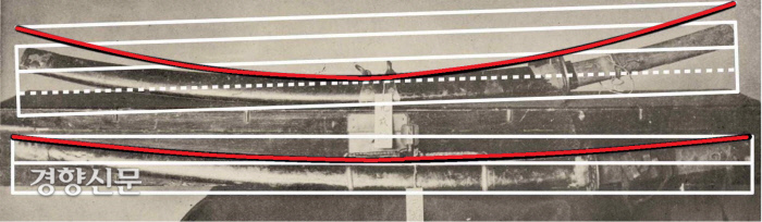 무엇보다 칼날의 ‘휨 정도’(곡률)를 보십시요. 하단 칼을 기준으로 상단 칼이 43도 정도 뒤로 누워(기울어져) 있는데요. 그렇게 누운 상단 칼을 바로 올렸다고 치고 계산하면 상단 칼은 하단 칼보다 70%(1대 1.71)이상 더 ‘휨의 정도(곡률)’가 큽니다. 이 정도의 휨 차이가 있다면 두 칼은 전혀 다른 형식의 칼로 규정할 수 있습니다.