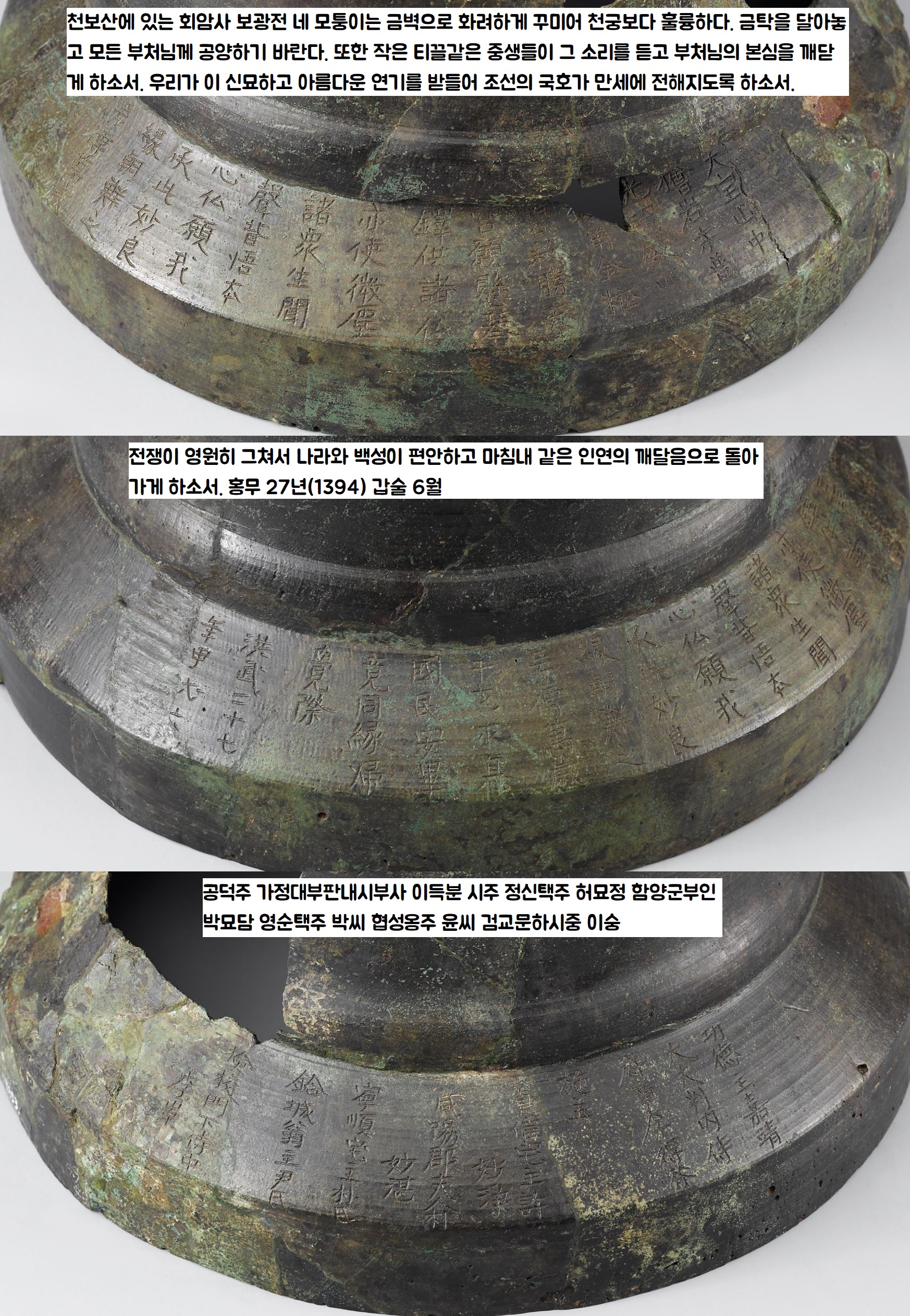 ‘천보산 중턱 회암사 보광전 네 모서리 추녀 끝에 매단 금탁(풍경)’이라는 뜻의 명문내용이었다. 청동기에 새겨진 명문 134자를 검토하던 조사단은 이 금탁이 여느 풍경과 다르다는 점을 금방 알게 됐다.