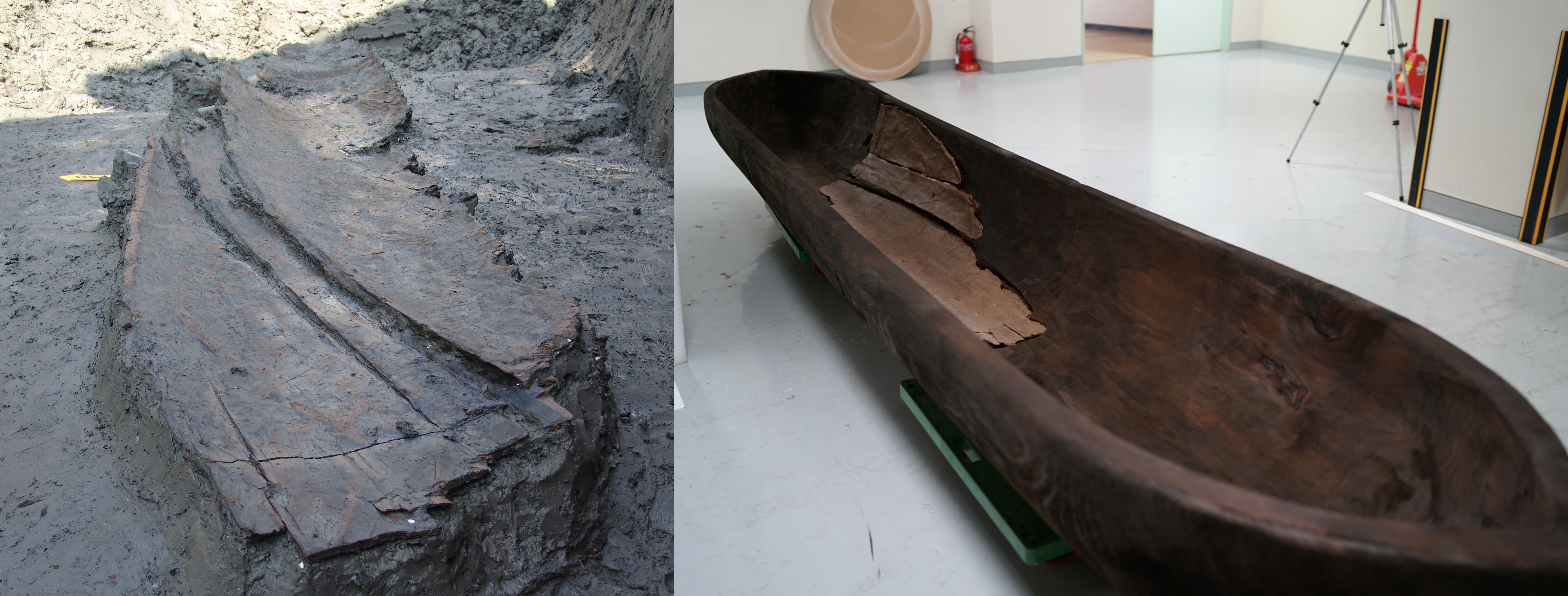 신석기 시대 비봉리 배의 출현은 그야말로 고고학 발굴 사상 역사적인 성과였습니다. 배는 비봉리 유적의 가장 아래층, 즉 신석기시대 중에서도 조기층(7700년 전)에서 출토됐는데요. 남아있던 배의 최대길이는 310㎝였고, 최대폭 62㎝, 두께 2.0~5.0㎝였습니다. U자형으로, 통나무를 파내 만든 배였습니다.