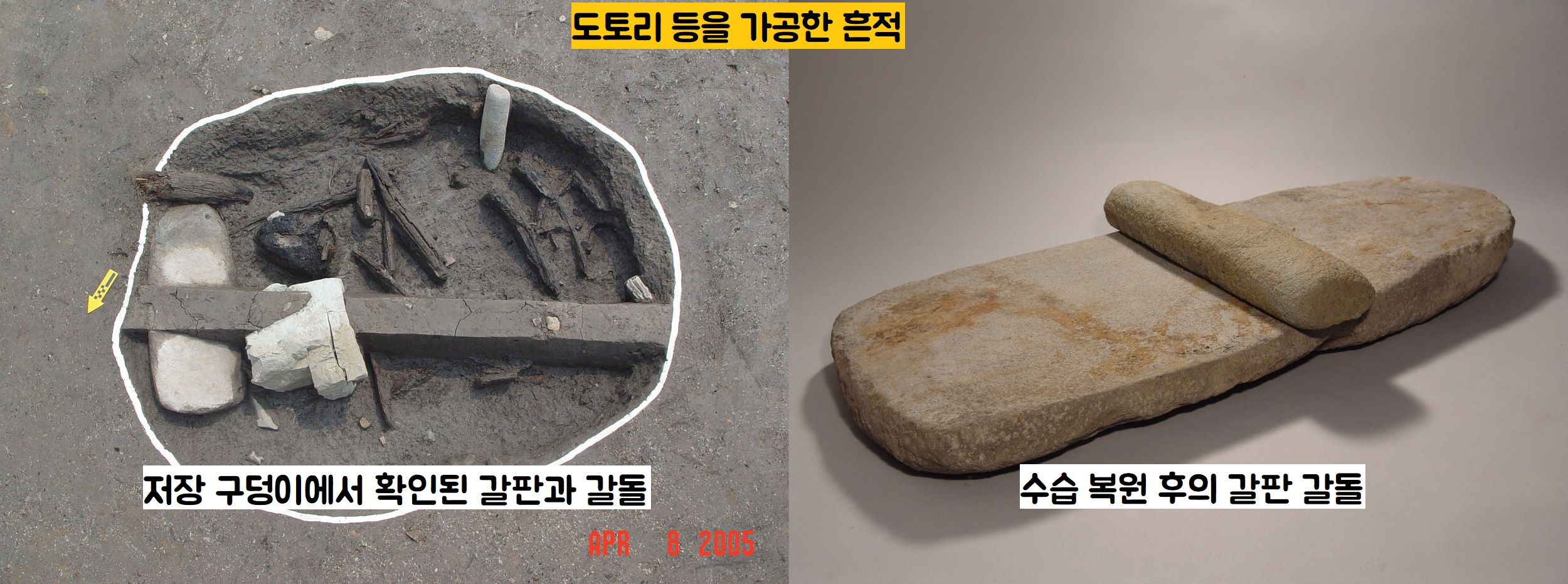 가공시설이었던 구덩이도 보였는데요. 파쇄된 도토리 껍질이 확인된 저장공 2기와, 갈돌과 갈판이 출토된 저장공 1기들이 바로 그런 곳들입니다. 저장구덩이 안에서 도토리를 가공했을 수도 있는 복합기능공간이었다는 얘기가 됩니다.