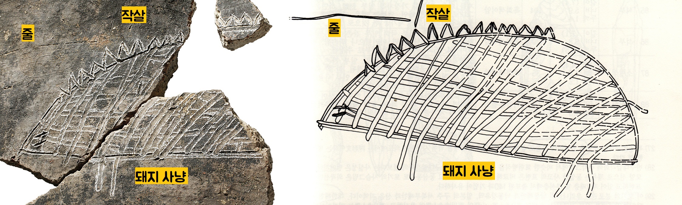 비봉리에서는 멧돼지가 그려진 토기조각도 발견되었는데요. 토기편의 위쪽과 옆선에 작살과 줄을 표현한 것 같은데요. 아마도 사냥장면을 표현했을 가능성이 있죠. 당시 발굴을 지휘한 임학종씨가 그럴듯한 상상의 나래를 폈습니다.
