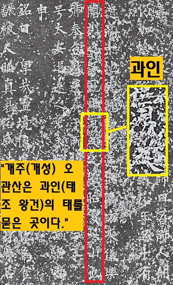 지금까지는 ‘개주의…는 태를 묻은 곳(之藏胎處)’이라고만 해독되었다. 그런데 이번에 뜬 선명한 탁본에서는 ‘과인(寡人·태조의 자칭)’과 함께 ‘오관산(五冠山)’자가 새롭게 읽혔다. 오관산은 개성 용흥동과 장풍군 월고리와의 경계에 있는 산이다. 다섯 개의 봉우리가 갓처럼 생겼다 해서 오관산(五冠山)이라는 이름이 붙었다. 이번에 뜬 탁본에서 ‘태조 왕건의 태가 묻힌 개성 오관산’이라는 사실을 알게되는 망외의 소득을 올린 것이다. 물론 어떤 사료에도 없는 내용이다.