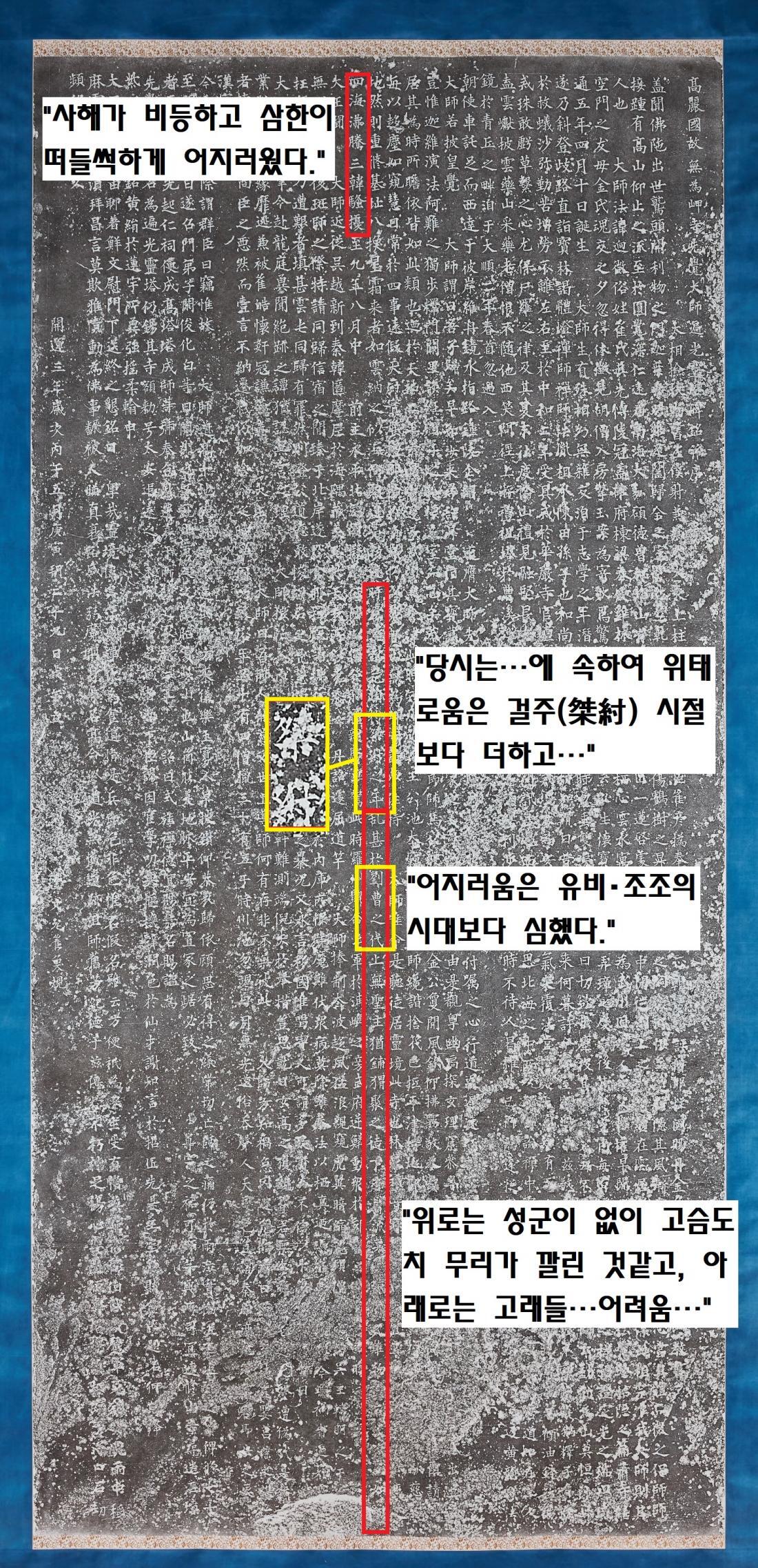 즉 이 부분의 비문은 “두루…무고한 사람을 마구 죽이니, 이에 어려움을 당한 경우가 구름 모이듯 꽉 차서 함께 (선각대사는) 유죄로 몰렸다”는 것으로 시작한다.