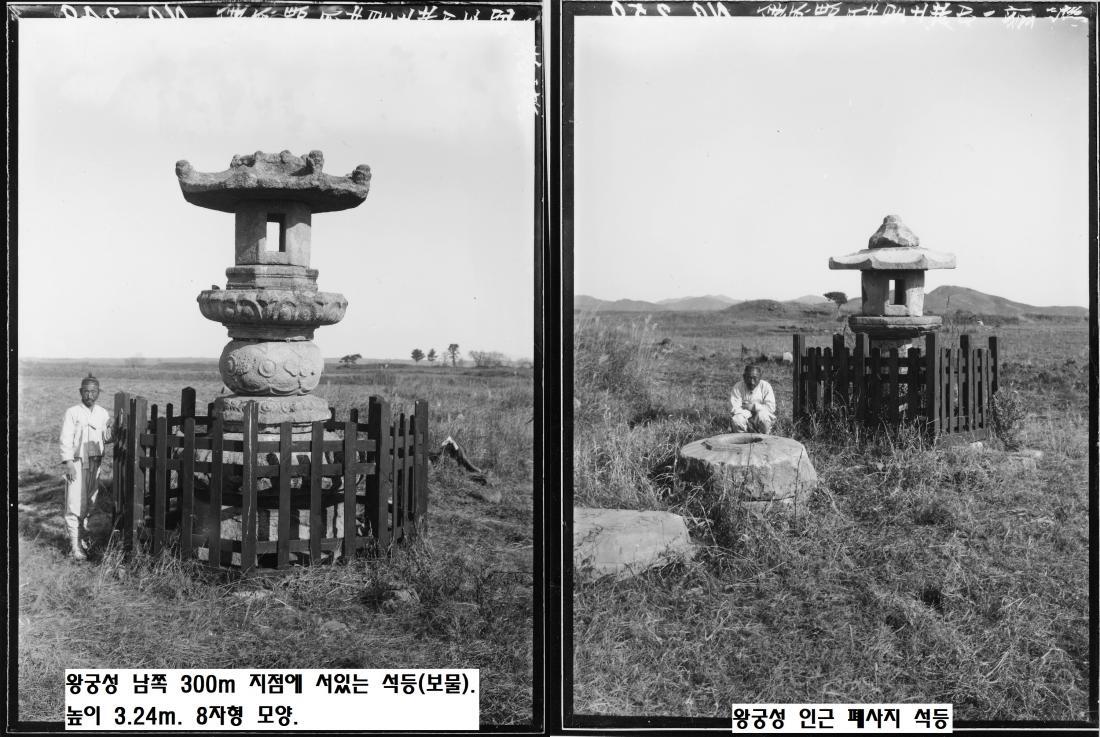 일제강점기 철원성의 사진. 왼쪽은 왕궁성 남쪽 300m 지점에 우뚝 서있는 석등. 석등의 높이는 3.24m이며 8자형 모양이고 5층에 석등이 들어있다. 일제강점기에 보물로 지정됐다. 오른쪽 사진은 철원성 폐사지에서 확인된 석등이다.|국립중앙박물관 소장