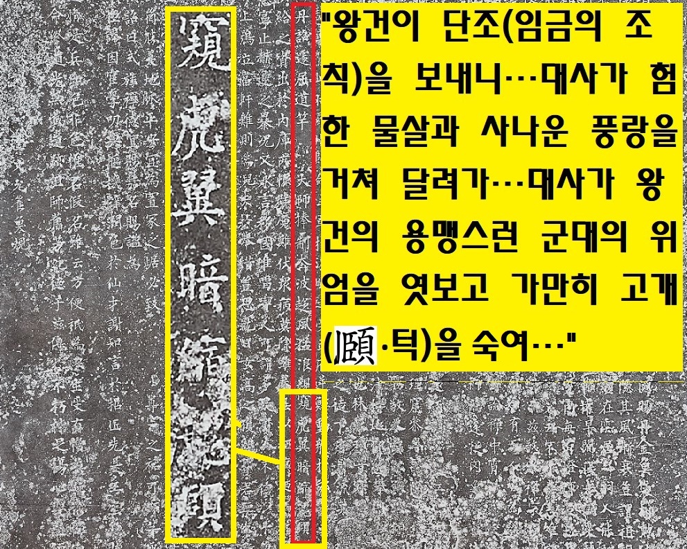 그래서 “대사의 용과 같은 지혜를 가만히 숙이셨다”든가, “왕은 좌우에 권위를 나타내기 위해 세워둔 용두(龍頭)를 치우기까지 했다”느니 하는 도무지 알 수 없는 해석이 난무했다. 그러나 ‘머리 두(頭)’자가 아니라 ‘턱 이’로 판독하면 쉬워진다. 즉 “선각대사가 용맹스런 왕건의 위엄을 간파하고 고개를 숙였다(턱을 내렸다)”고 해석할 수 있다. 선각대사가 왕건의 군세를 보고 귀의를 결심했다는 시나리오이다.