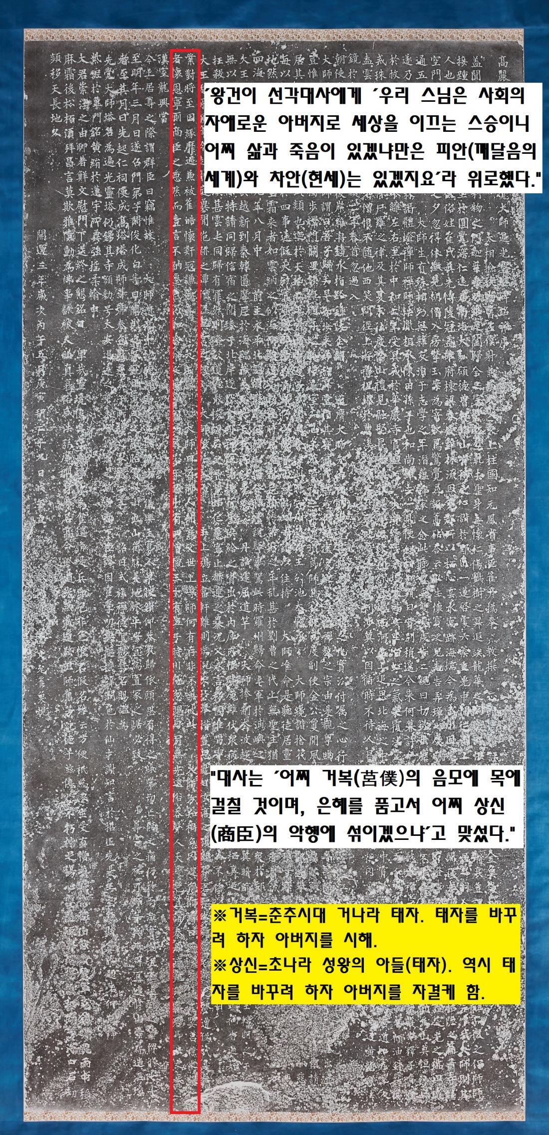 언급된 현고(402~444)는 북위 태무제(423~452)의 폐불 때 처형된 승려이다. 선각대사가 포악한 궁예에게 박해를 받아 죽임을 당한 것을 빗대 표현했다. ‘혼군’(어리석은 군주)은 당연히 ‘궁예’를 가리킨다. 이때 왕건이 등장한다.