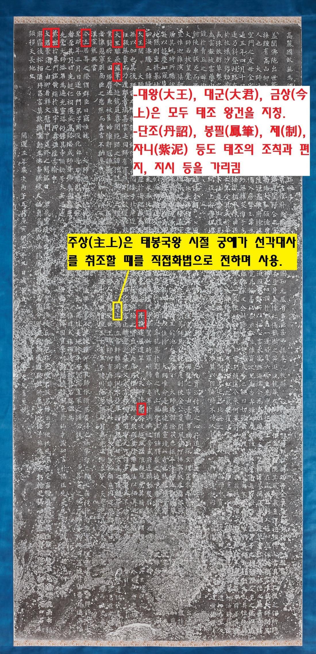 이쯤에서 문제를 제기할 수 있겠다. 왕건이 선각대사를 초청하면서 ‘단조(丹詔·임금의 조칙)’나, ‘제(制·임금의 말씀)’라는 표현을 ‘감히’ 썼다는 것이다. 하긴 ‘대왕(大王)’자도 3번 나온다. ‘대군(大君·큰 임금)’과 ‘금상(今上·현 임금)’, ‘자니(紫泥·임금의 조서)’ 등의 표현도 보인다. 이를 두고 그럴 듯한 견해가 제기된 바 있다.