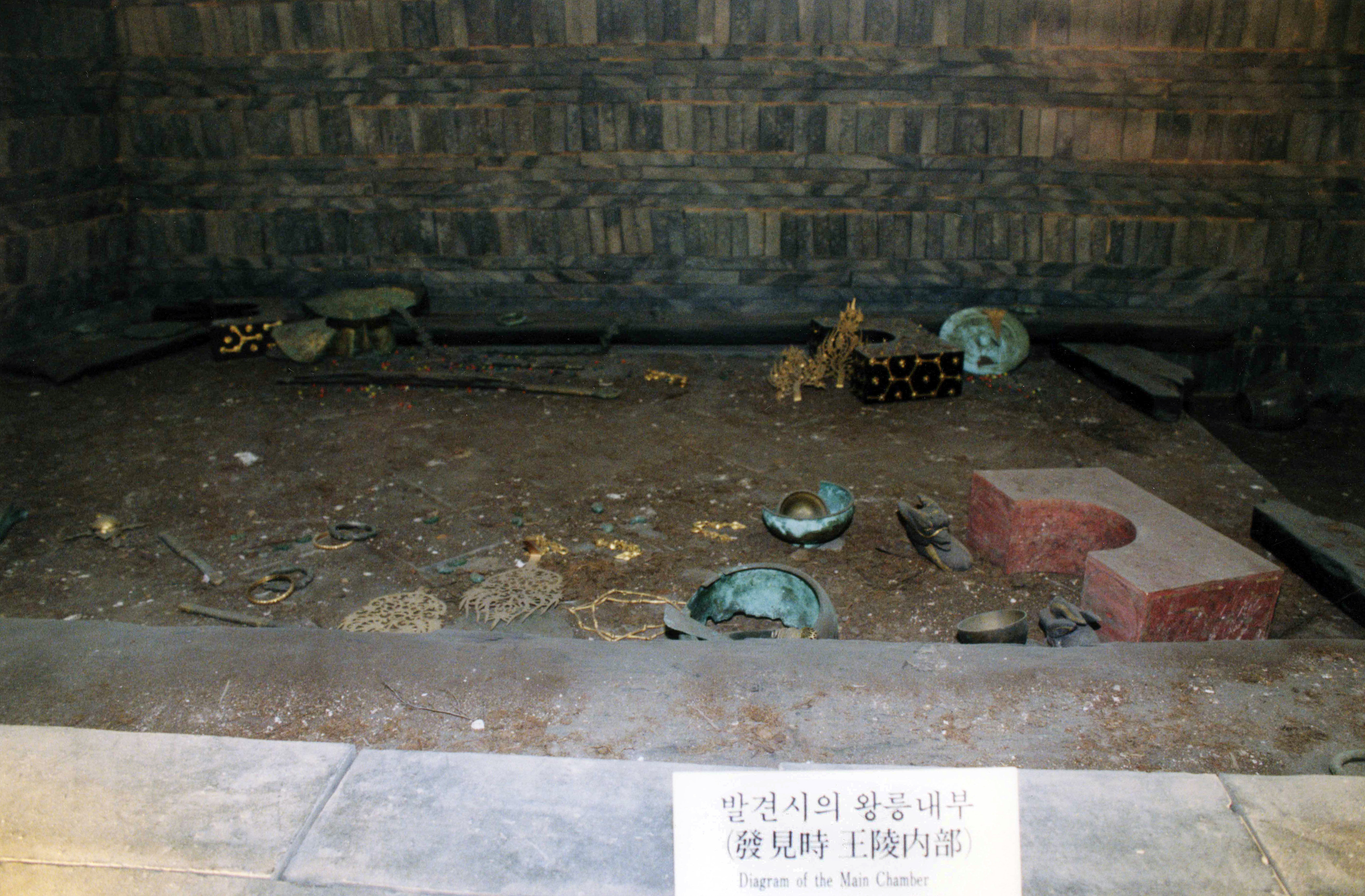 발견당시의 무령왕릉 내부를 재현한 모습. 저런 상태를 유지해놓고 차근차근 발굴했어야 했다.