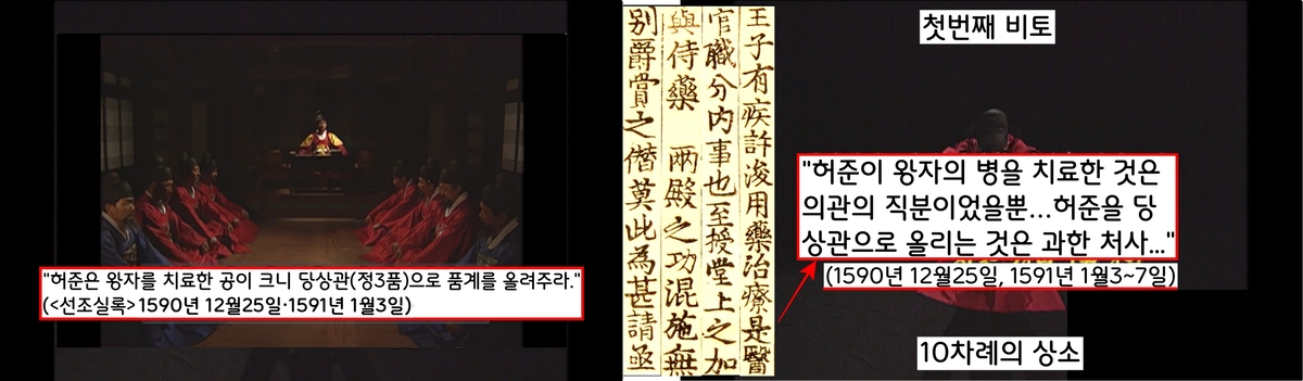“허준이 어의라는 직분으로 왕자의 병을 치료한 것입니다…자기 일입니다. 그런 허준을 당상관으로 품계를 올리다니…상급이 지나칩니다….”(<선조실록> 1591년 1월3일)