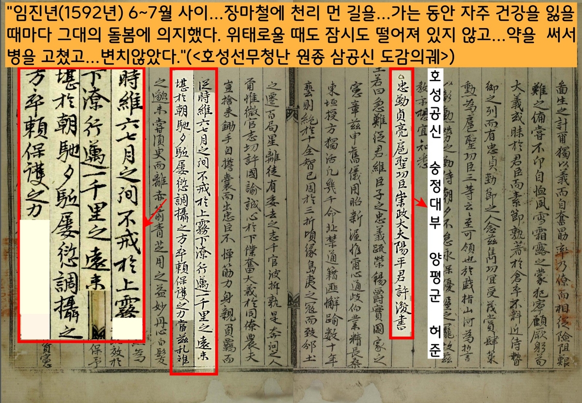 허준에게 내린 <공신도감의궤>(규장각 소장)에서 선조는 “허준은 위급한 시기에 잠시도 떨어져 있지 않고…약을 써서 병을 고쳤고…그런 마음을 끝까지 변치 않았다”고 치하했다.
