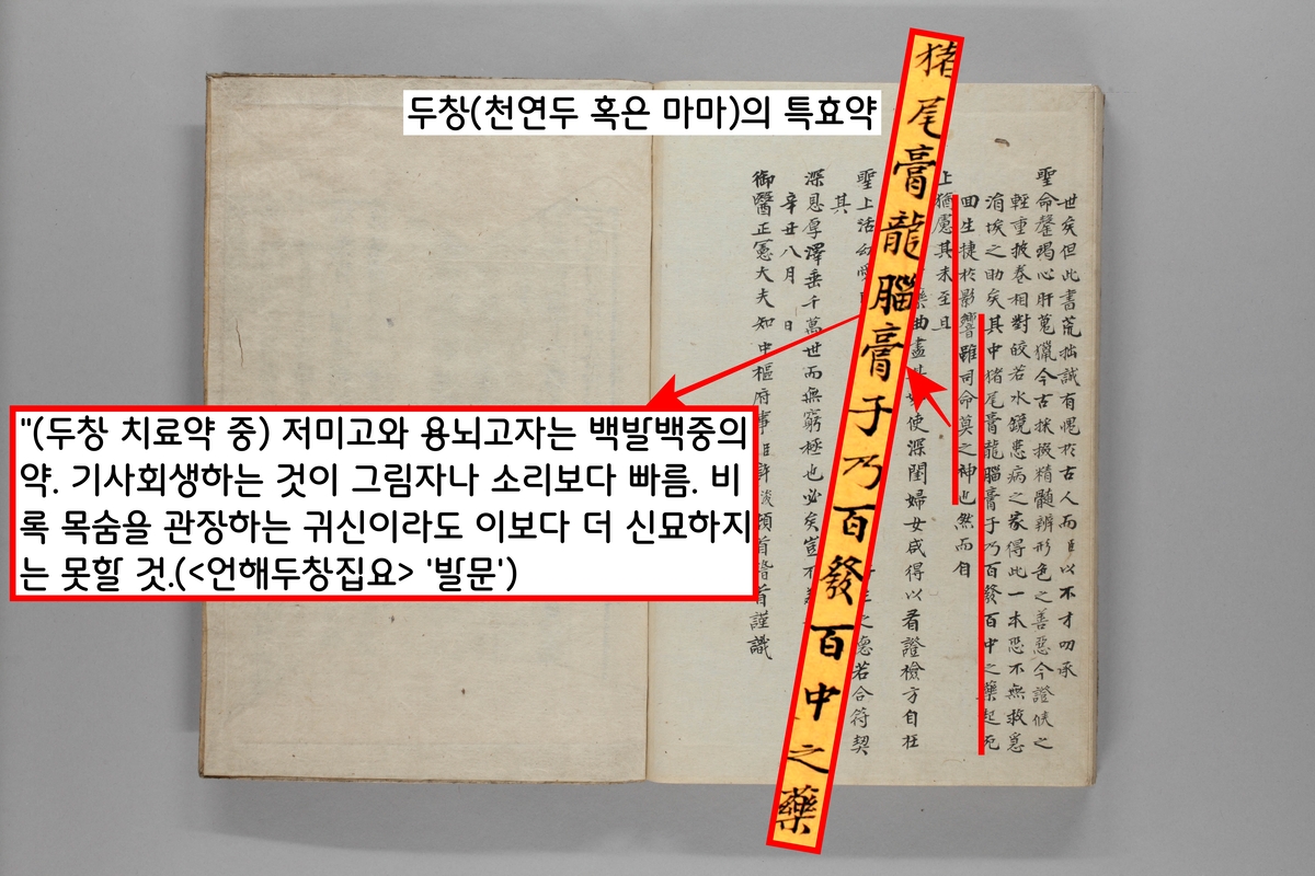 <언해두창집요>의 서문 말미에 ‘두창’의 치료 약제를 언급하면서 ‘저미고’와 ‘용뇌고자’를 콕 찍었다.
