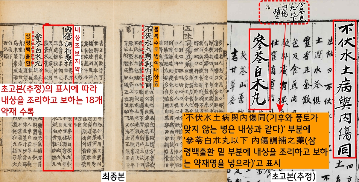 또 초고본(추정)에서 ‘不伏水土病與內傷同(기후와 풍토가 맞지않는 병은 내상과 같다)’ 항목 위에 ‘…내상을 조리하고 보하고 약재를 쓰라’고 표시해놓았다. 역시 최종본은 이 표시를 반영하여 ‘내상조보약재’ 18종을 나열했다.
