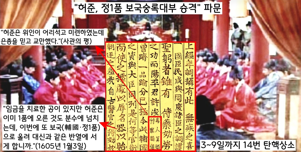 이 문제를 두고 사헌부와 사간원은 14차례에 걸쳐 상소를 올린다. 선조는 결국 6일 만인 1월9일 허준의 승급이 취소됐다. 조정에서 ‘허준 비토’ 분위기가 만만치 않았음을 다시 한 번 보여준 대목이다.