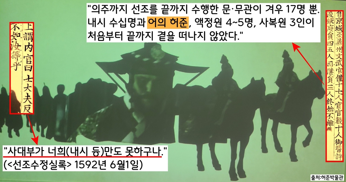 “상(선조)이 피란을 떠날 때…명망 진신들이 모두 상의 곁을 떠나…의주에 이르기까지 선조를 따른 문무관은 겨우 17명…나머지는 환관 수십 명과 어의 허준, 액정원(왕명 전달 하급관리) 4~5명, 마부와 말관리인 3명 등….”(<선조수정실록> 1592년 6월1일)