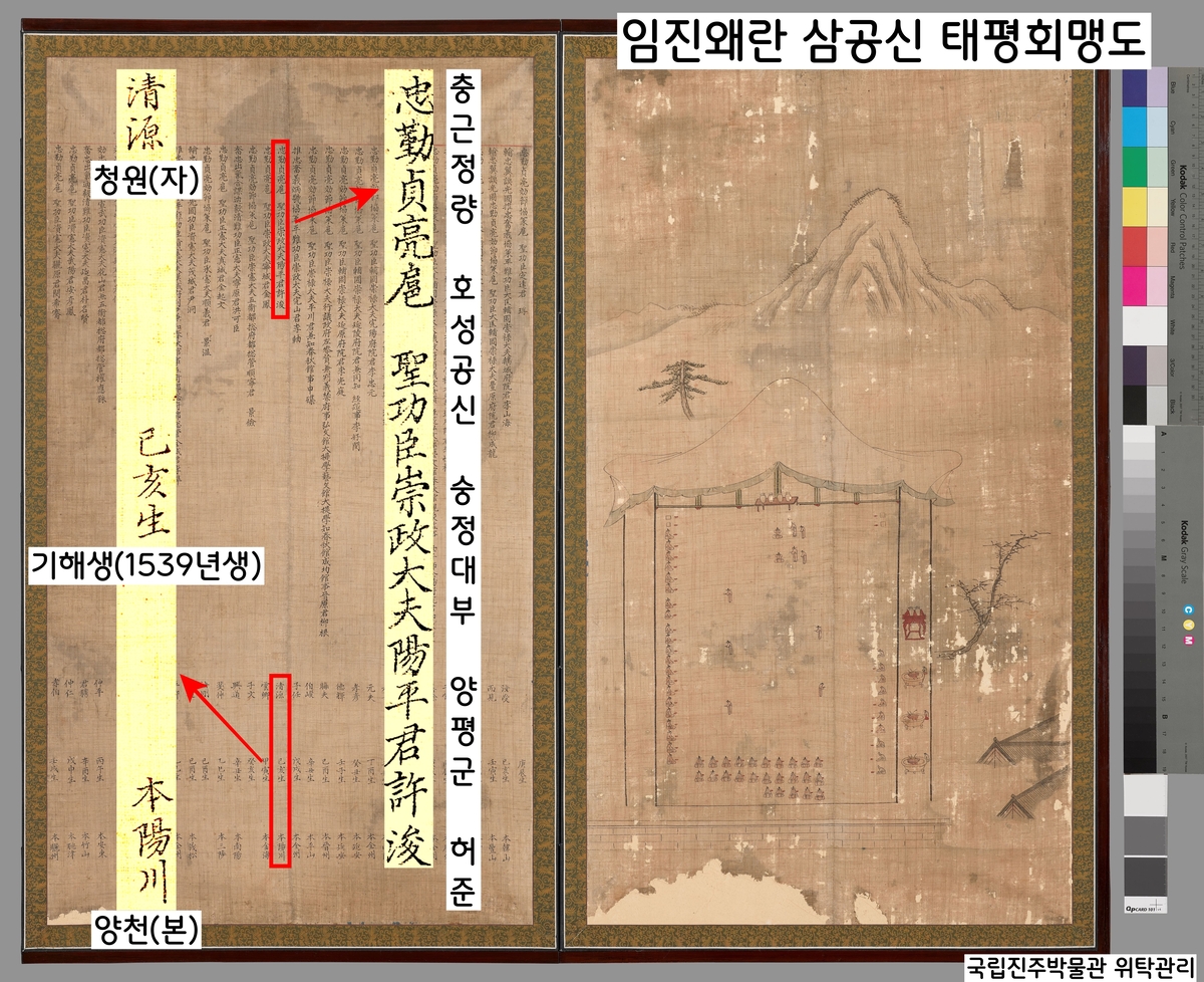 임진왜란 공신들의 연회를 그린 ‘태평회맹도’(보물). 허준은 임진왜란 때 의주까지 피란하는 선조를 수행했다는 공로로 호성공신(3등)이 되었다. 허준은 ‘양평군’의 군호와 함께 숭정대부(종 1품)의 작위를 받았다.|국립진주박물관 위탁관리