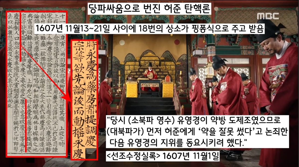 ‘허준 탄핵론’은 소북파와 대북파의 당파 싸움으로 활용되어 요원의 불길처럼 번졌다. 8일간 무려 18번의 사직 상소가 핑퐁식으로 이어졌다.