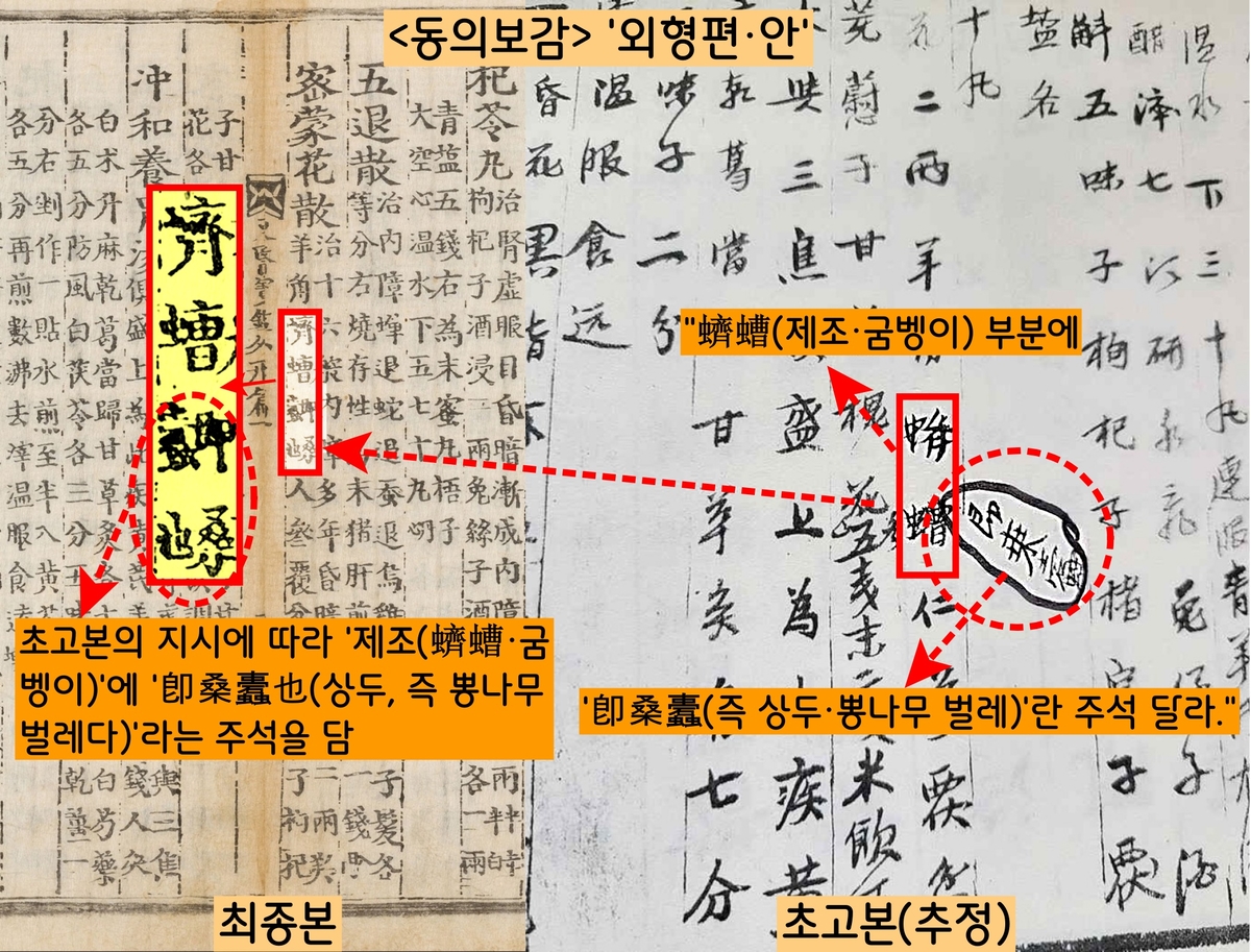 초고본(추정)에서 ‘외형편 안(眼·눈)’편에 ‘제조(굼벵이)’를 쓰면서 ‘즉상두(卽桑두·즉 뽕나무 벌레)’라는 주석을 달라는 표시를 해놨다. 그런데 최종본(1613년 발행)이 이를 그대로 반영했다. ‘제조’라고 써놓고 작은 글씨로 ‘즉상두(이것은 뽕나무 벌레다)’라는 주석을 달았다. |최영성 교수 논문을 토대로 정리