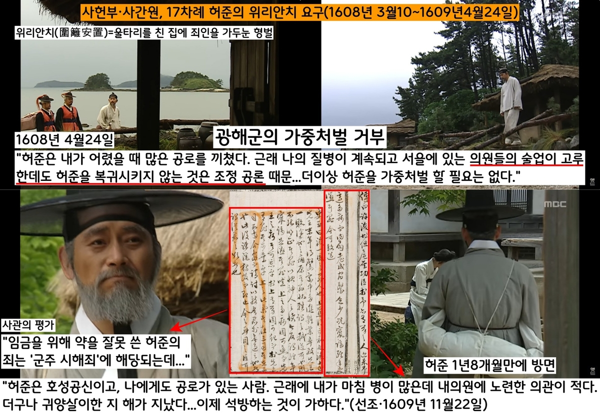 대간들은 무려 17차례에 걸쳐 “허준을 위리안치 시키라”고 아우성 친다. 광해군은 ‘위리안치’가 아닌 ‘중도부처(유배형)’의 처벌을 내린다. 그러나 광해군은 1년8개월만인 1609년 11월 “허준은 나에게도 공로가 있는 의사”라면서 “무엇보다 허준만한 노련한 의사가 없다”고 밝히면서 유배에서 풀어준다.