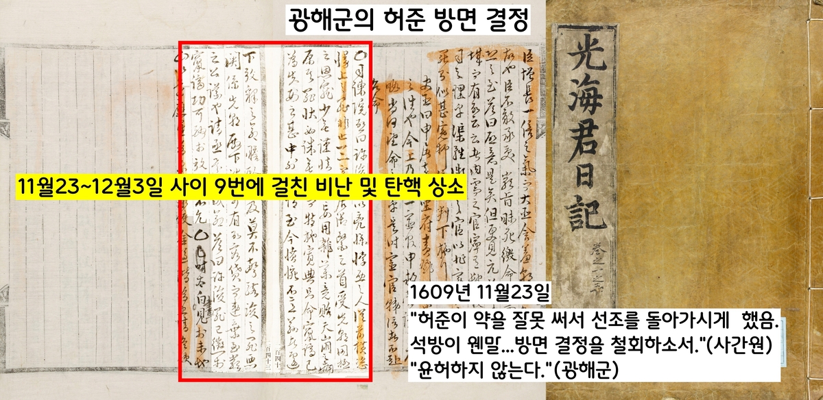 이를 두고 “허준의 죄상은 임금을 시해한 것과 같다”(<선조실록> 22일·사관)고 평가했고, “석방 명령을 거두어 달라”(23일·사간원)고 촉구했다. 9번의 상소가 올라왔다. 그러나 광해군은 꿈쩍도 하지 않았다. 내의원에 복귀한 허준은 임금의 병을 돌봤다.