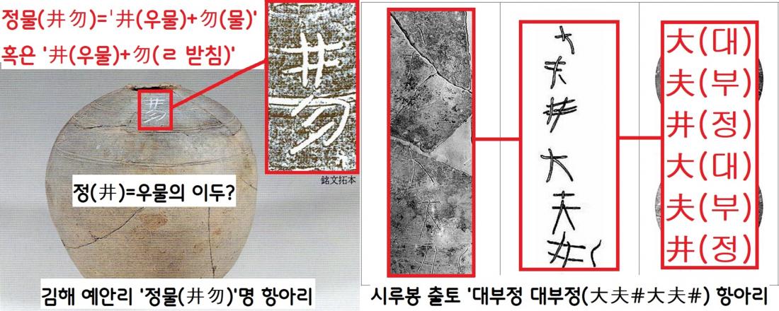 김해 예안리에서 출토된 ‘정물(井勿)’ 명문을 두고 ‘井(우물)+勿(물)’, 또는 ‘井(우물)+勿(ㄹ)’와 같은 이두 표기로 보는 견해도 있다.(왼쪽 사진) 경기 구리 시루봉에서는 ‘大夫#大夫#’으로 이어지는 명문 토기가 출토됐다. ‘글자(대부)+글자(정·우물)+글자(대부)+글자(정·우물)’ 등으로 6자 전체를 하나의 문구로 볼 수도 있다는 견해가 등장했다.