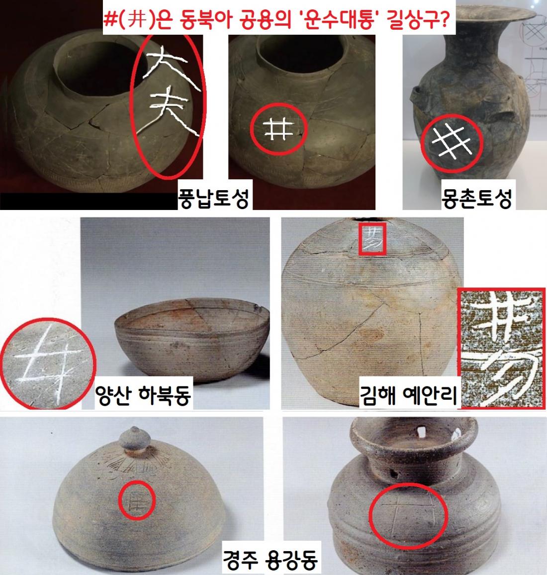그 사이 #(井)자와 †(十)자는 물론이고 Ⅹ, 卍, 小, 工 같은 수수께끼 같은 문양(혹은 문자)들이 새겨진 일상 토기가 쏟아져 나왔다. 지안(集安)과 변경 지역(남한) 등 고구려는 물론이고 백제나 신라 영역에서도….
