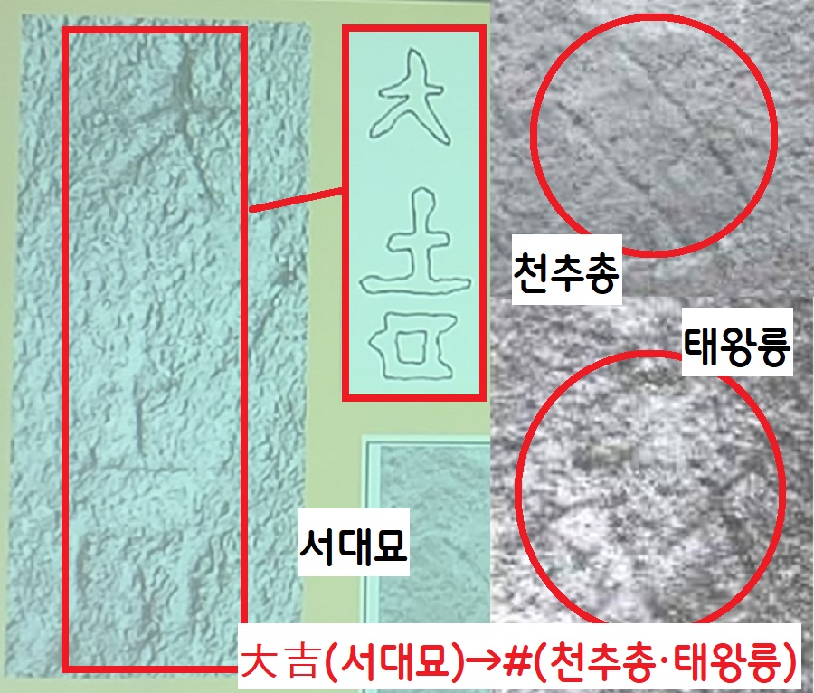 서대묘 장대석에 새긴 길상구 ‘대길’이 늦은 시기에 조성된 천추총과 태왕릉의 계단석과 지대석에서는‘#(井)’으로 바뀐다. 4세기 전반까지 고구려 왕릉급 무덤에 쓰인 길상구가 ‘대길(大吉)’에서 4세기 후반이 되면 ‘#’으로 바뀐다는 것이다.|여호규 교수 제공