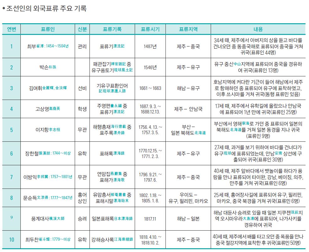 따지고보면 표류민들은 본인의 의사와 관계 없이 시꺼먼 바다 속에서 정처없이 헤매면서 무수히 많은 고초를 겪은 사람들이다. 그러나 달리보면 한반도에 갇힌 당대 조선의 울타리에서 벗어나 넓은 세상을 맛본 행운아들이기도 하다. 1만명이 넘는 표류인 중 극히 일부지만 어떤 이는 한글 대자의 진흘림체를 남겼고, 또 어떤 이들은 신세계의 경험을 생생한 필치로 남겼다. 혹은 실록의 기자인 사관의 붓끝을 통해, 혹은 그들이 목격한 신천지에 눈과 귀를 기울인 대필작가의 손에 의해 기록으로 전해졌다.