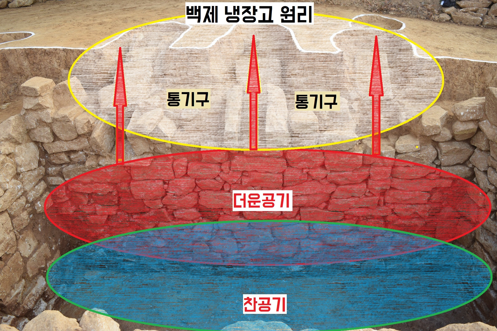 이 통기구 덕분에 이 두 기의 저장고를 ‘백제판 냉장고’로 특정할 수 있었습니다. 옛날 석빙고의 구조에서도 보듯 이 통기구가 더운 공기를 밖으로 배출시키는 역할을 하는 겁니다. 찬 공기가 바닥에 깔리고 더운 공기가 상승하는 대류의 원리를 이용한 거죠. 바닥은 습기를 차단하도록 잡석과 모래성분이 섞인 점토를 섞어 다졌습니다.톻