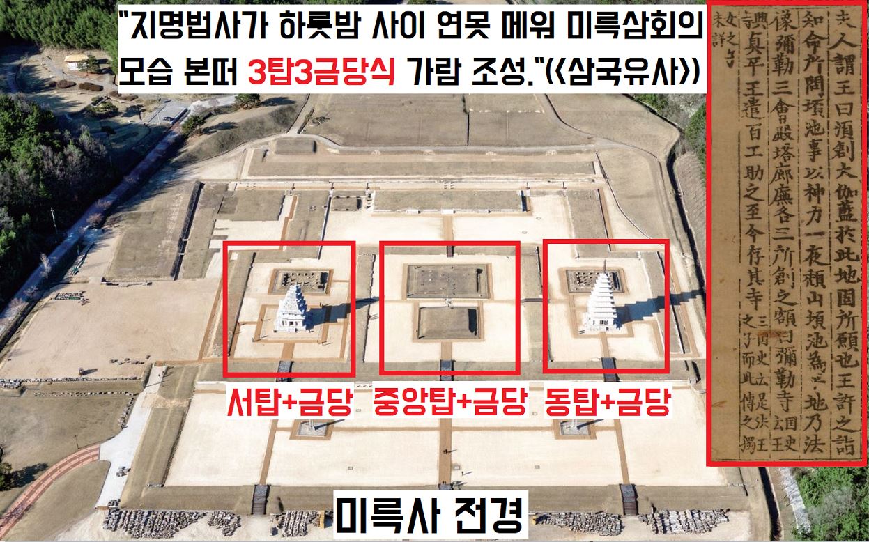 그것을 뒷받침하듯 미륵사는 ‘중앙탑+강당’, ‘서탑+강당’, “동탑+강당” 등 3탑3강당으로 조성된 것이 확인됐구요. 연못과 같은 습지에 조성되어 있다는 것도 확인됐습니다.