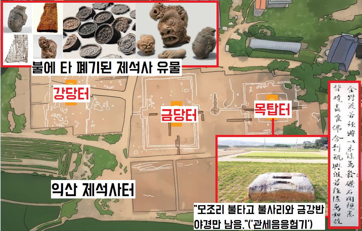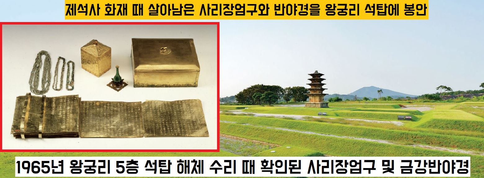 즉 “백제 무광왕(무왕)이 지모밀지(금마·익산)로 천도하여 사찰을 경영했다. 하늘에서 비와 함께 뇌성벽력이 내리쳐서 새로 지은 제석정사가 재해를 입었다(정관 13년·639년)”는 내용이었습니다. <관세음음험기>는 제석정사가 당한 피해사례를 언급하면서 “탑 아래 초석 속에 넣어두었던 귀중품 가운데 불사리병과 금강반야경만이 기적적으로 무사했다”고 특별히 기록했습니다.