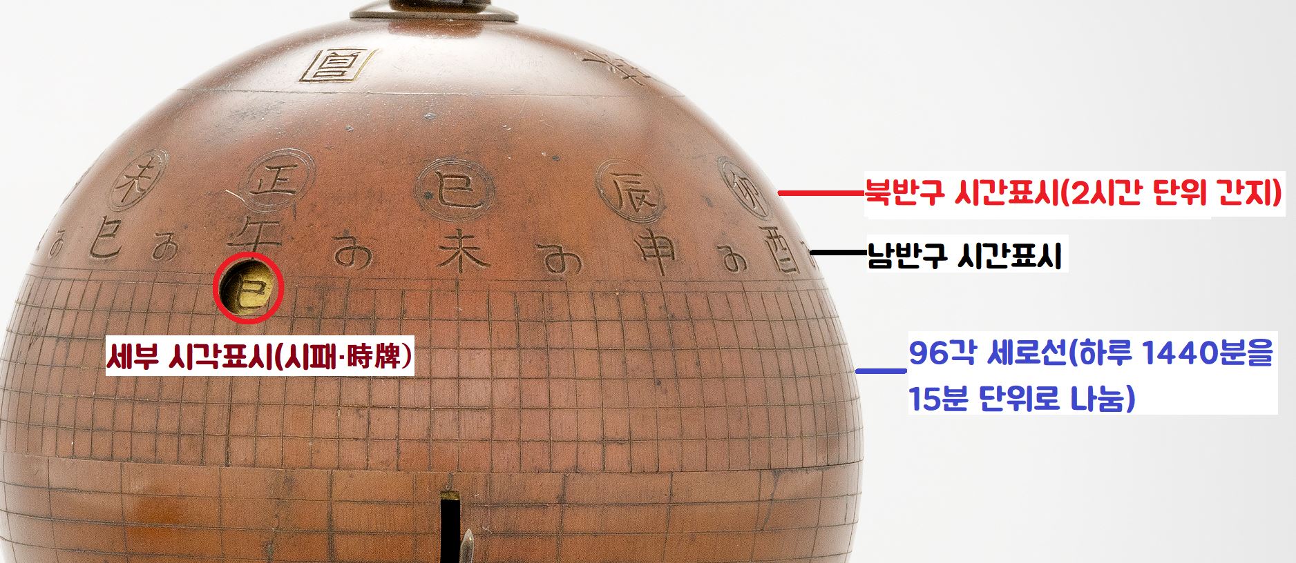 위쪽 반구는 고정되어 있고, 아래 반구는 좌우로 돌릴 수 있습니다. 위쪽 반구에는 시간을 표시한 간지(2시간 단위) 글자와, 시각을 나타나는 세로선 96각(하루 1440분을 15분 단위로 나눔)이 새겨져 있습니다.