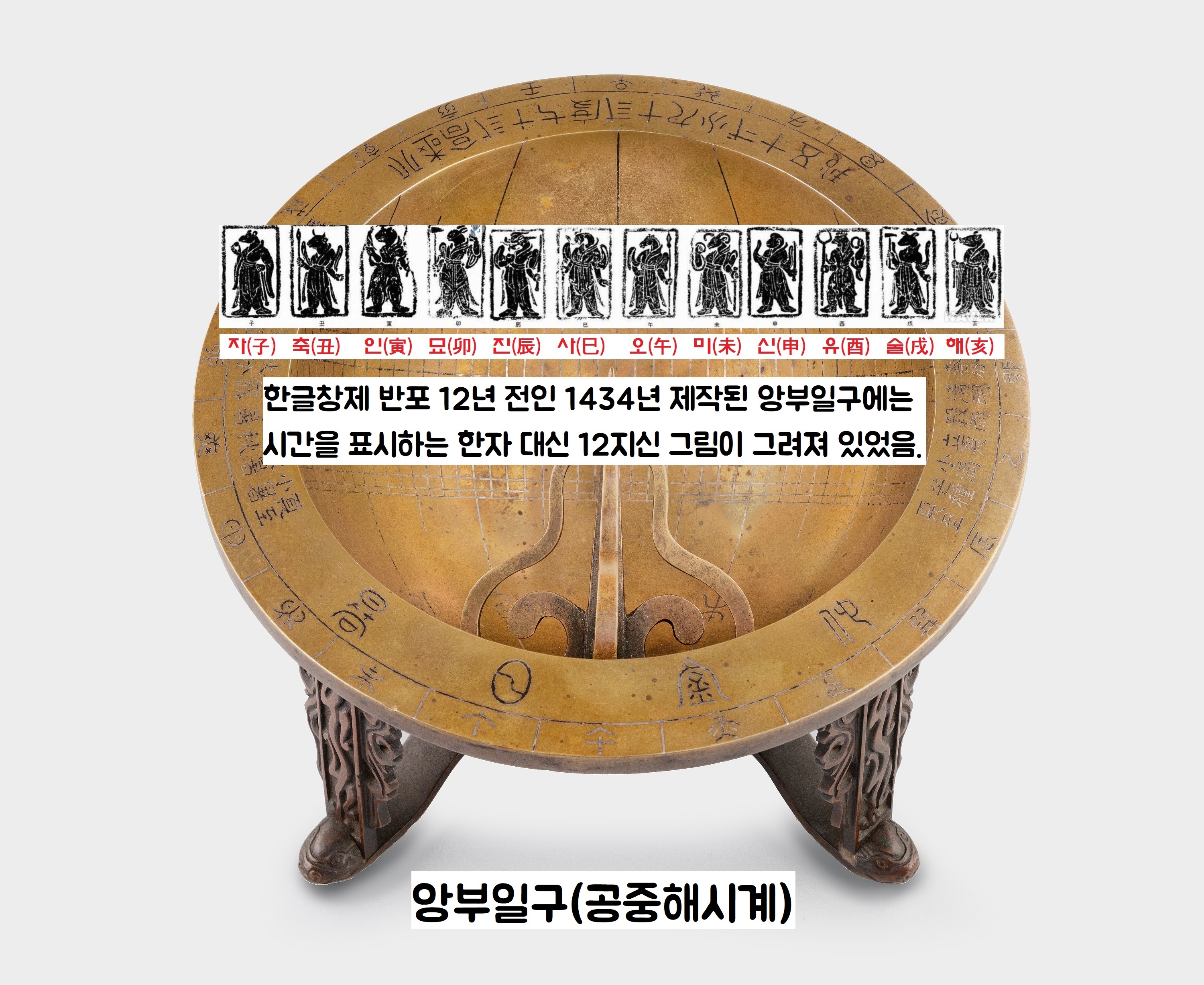 그러나 앙부일구를 대로변에 설치한 1434년은 한글이 창제·반포되기 12년 전의 일이죠.