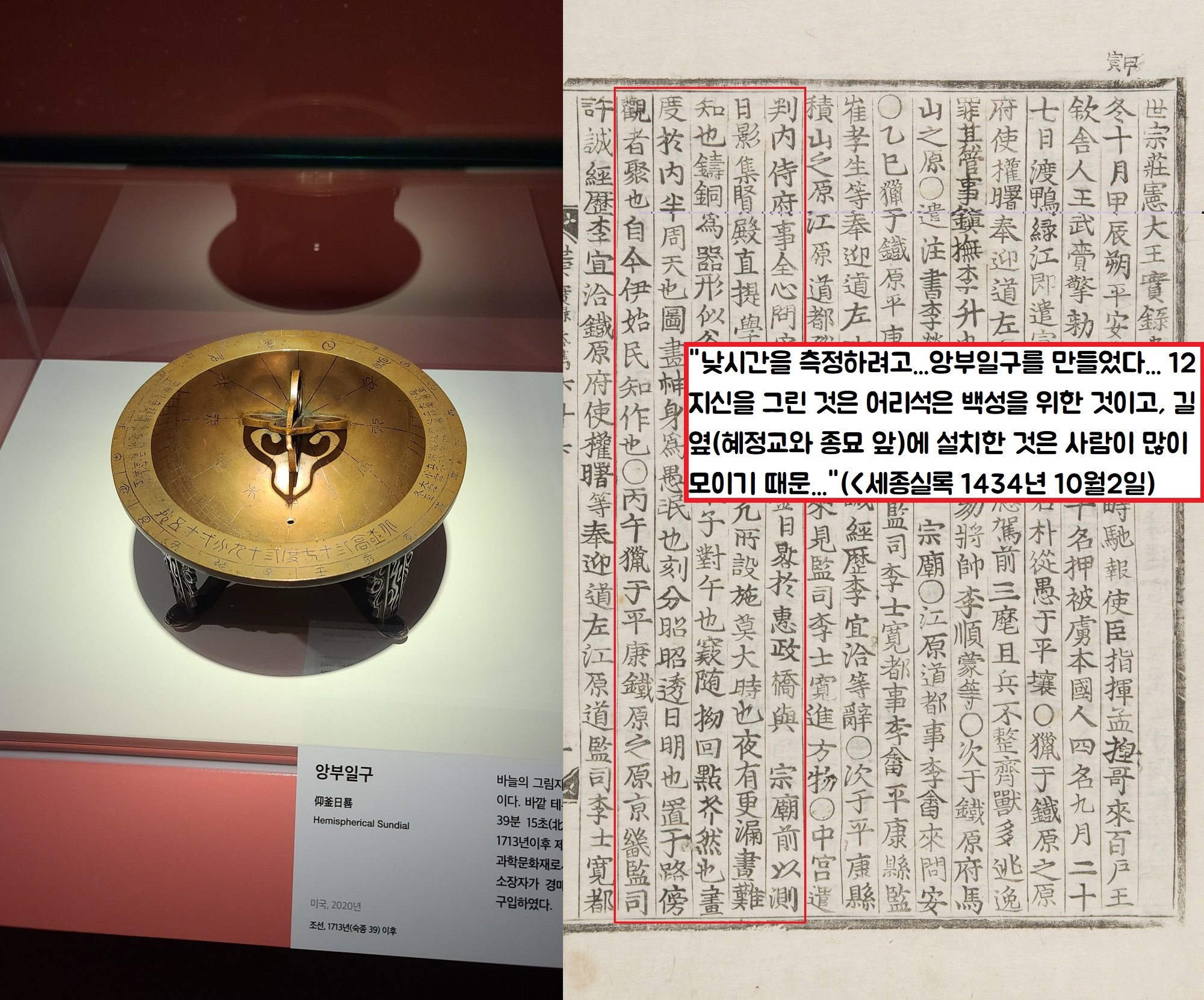 “때를 아는 것보다 중한 것이 없는데…밤에는 자격루(물시계)가 있지만 낮에는 알기 어려워…12지신의 몸을 그렸으니 어리석은 백성을 위한 것이요…혜정교 옆(종로 1가 광화문 우체국 부근)과 종묘 남쪽 거리에 앙부일구를 설치했다. 길 옆에 설치한 것은 보는 사람이 모이기 때문이다.”