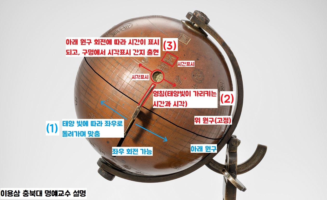 그러나 구입 환수한 ‘일영원구’는 두 개의 반구가 맞물려 각종 장치를 조정하면서, 어느 지역에서나 시간을 측정할 수 있도록 제작되었다는 겁니다. 회전축을 자구 자전축과 일치하도록 맞추면 남반구 여행 중에도 쓸 수 있답니다.