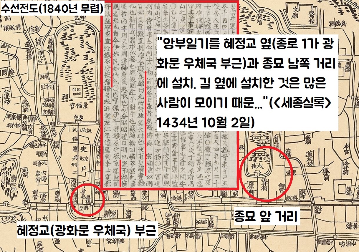 “때를 아는 것보다 중한 것이 없는데…밤에는 자격루(물시계)가 있지만 낮에는 알기 어려워…12지신의 몸을 그렸으니 어리석은 백성을 위한 것이요…혜정교 옆(종로 1가 광화문 우체국 부근)과 종묘 남쪽 거리에 앙부일구를 설치했다. 길 옆에 설치한 것은 보는 사람이 모이기 때문이다.”