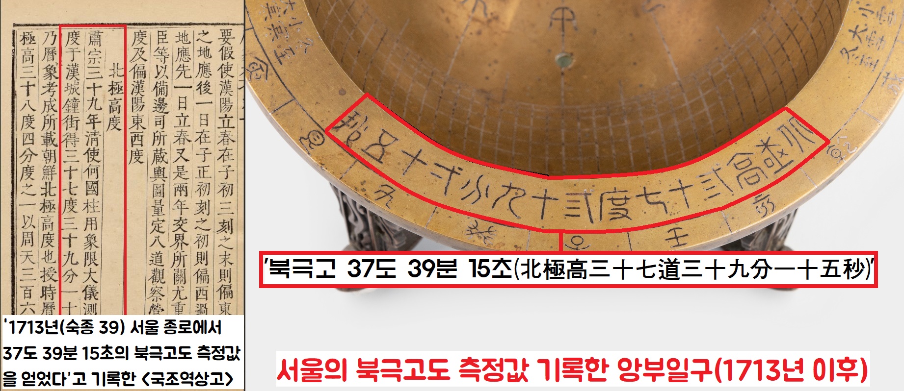 해 그림자가 드리워진 절기선과 시각선의 눈금을 읽으면 별도의 계산 없이 그때의 시각과 절기, 일출까지도 곧바로 파악할 수 있는 간편한 기구라 할 수 있습니다. 2020년 구입환수된 앙부일구(1713년 이후 제작)에는 서울의 위도를 정확하게 측정하고 영침을 서울의 북극고도(37도 39분 15초)에 맞추어 설치했다는 사실을 알려주는 명문이 새겨져 있는데요. 앙부일구는 서울을 기준으로 한 국가 표준시계였다는 뜻입니다. 앙부일구가 서울을 기준으로 한 국가 표준시계였다는 뜻입니다.