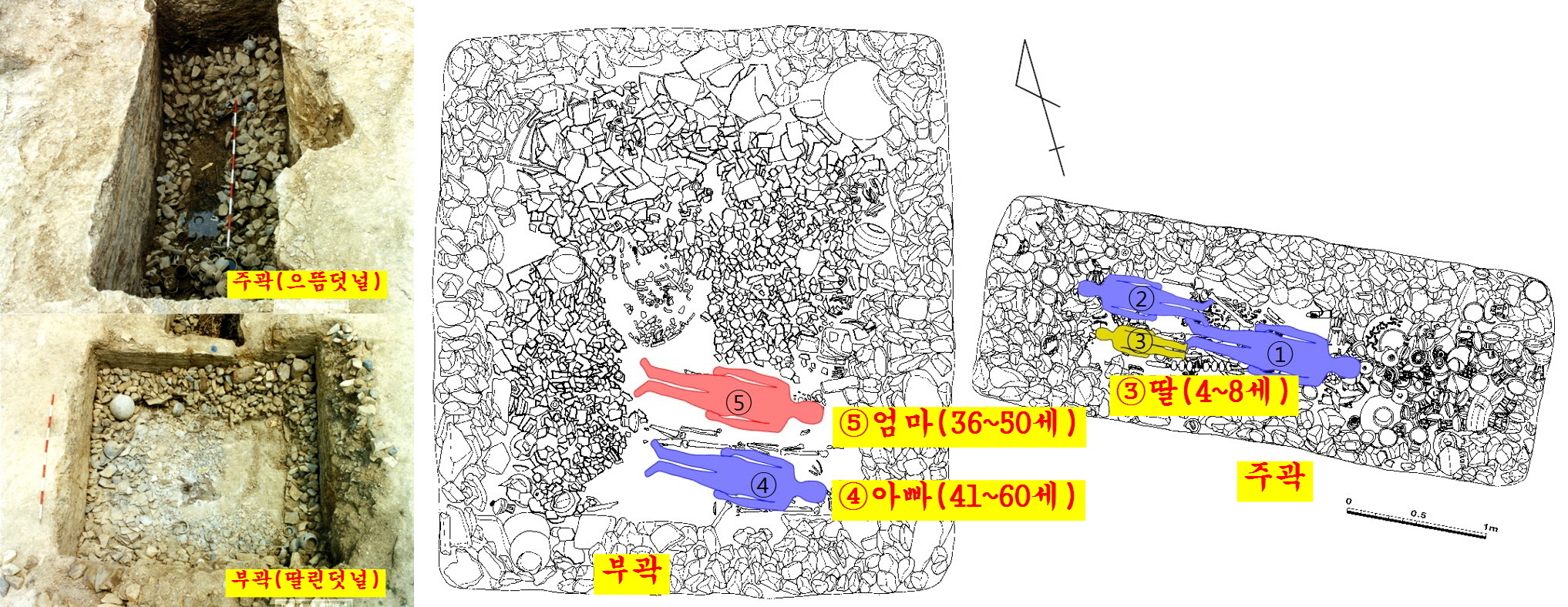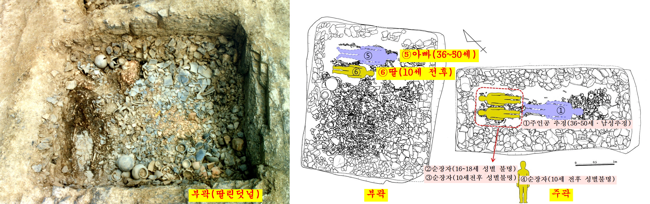 또 5세기 중후반에 조성된 또다른 무덤에서는 주곽에 안장된 주인공(성인 남성·31~40세)의 곁에, 여자아이(4~8세)가 누워 있었다. 그리고 그의 발치에 축조된 부곽 안에는 성인남성(41~60세)과 성인 여성(36~50세)이 순장되어 있었다. 그런데 DNA 분석결과 놀라웠다. 부곽에 순장된 성인 남녀는 부부이며, 이 부부의 딸이 주곽의 무덤주인공 곁에 순장된 여아(4~8세)임을 밝혀낸 것이다.